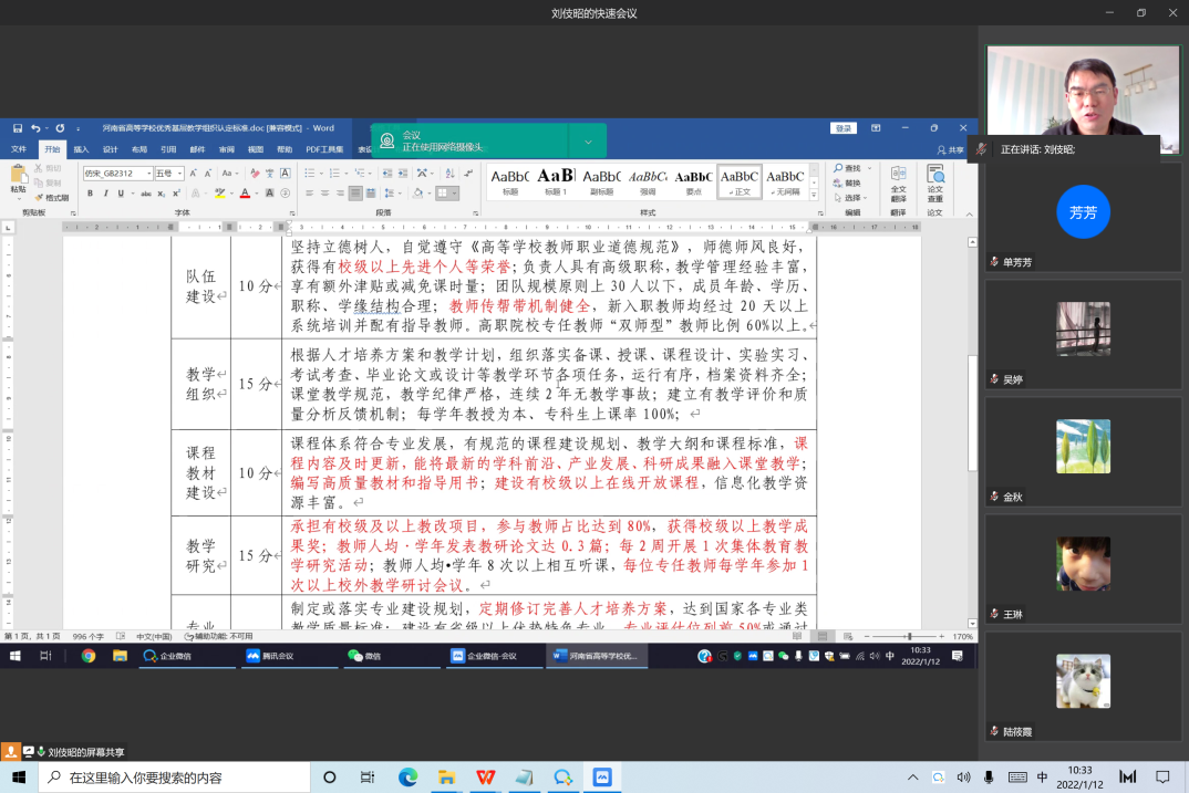 随后,刘伎昭主任领学了《河南省高等公司优秀基层教学组织认定标准》、《省级一流本科专业建设点申报工作要求》等文件,对标找差、进一步明确建设目标和任务;单芳芳副主任通报了实践教学总体情况,对实践环节存在的问题进行了梳理,并提出了切实可行的解决思路。