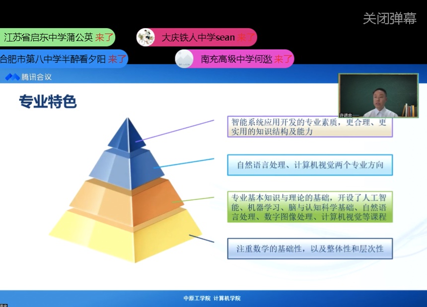 本次招生宣传直播活动分为四个专业专场,计科系主任王海龙以“计算新世界 数字新时代”为主题,网络系副主任张茜以“万物互联 网络为基”为主题、信息安全系副主任单芳芳、骨干教师高丽平以“信息通未来 安全稳天下”为主题,人工智能系副主任许进忠以“人工智能 改变未来”为主题,通过线上直播平台全方位向考生和家长介绍公司概况、专业特色、办学实力以及招生情况、员工就业、学科竞赛等内容,并与考生和家长进行线上互动,在线解答专业及招生等相关问题。精彩的讲解、积极的交流互动给考生们留下了深刻印象。