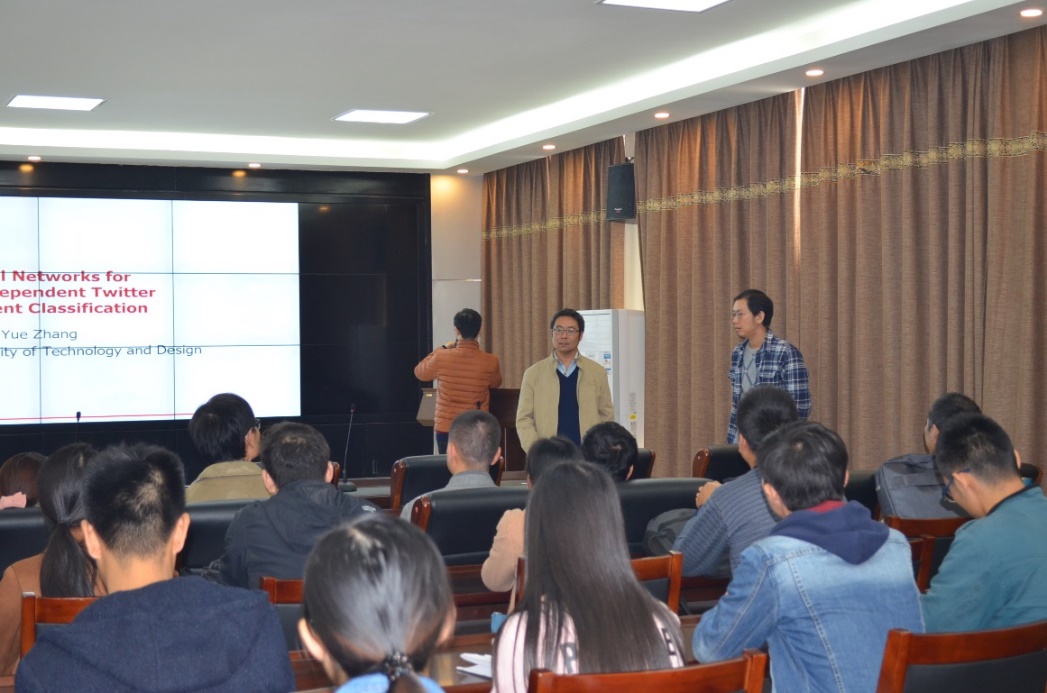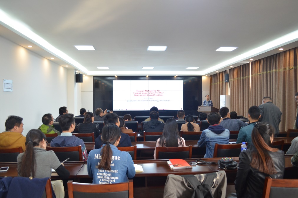 在近一个小时的讲座时间里,张岳老师重点为大家介绍了所带另的研究团队在针对特定目标的互联网文本情感分析最新研究。该研究在词汇的分布表征之上利用(neural pooling)函数对tweets文本中提及目标实体建立简单且符合直觉的文本特征表示。该研究成果目前已经发表在人工智能领域顶级国际会议AAAI 2016上。