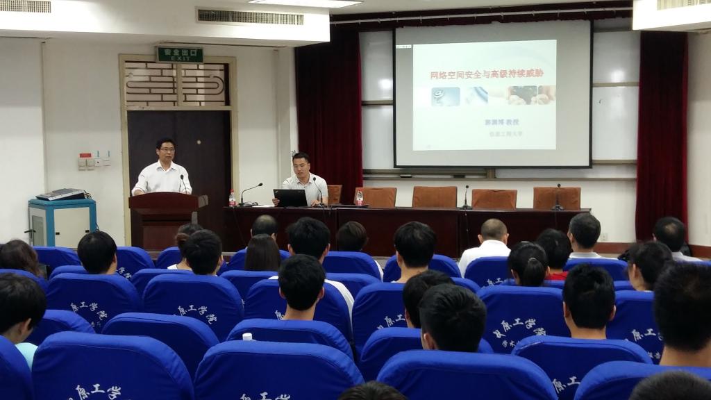 2015年5月17日下午,在南校区4号楼311学术报告厅,信息工程大学四院博士生导师郭渊博教授,做了题为“网络空间安全与高级持续威胁”的学术讲座,刘卫光副经理主持此次讲座,BSports网络安全方向组老师、全体研究生和网络工程专业本科生聆听了此讲座。