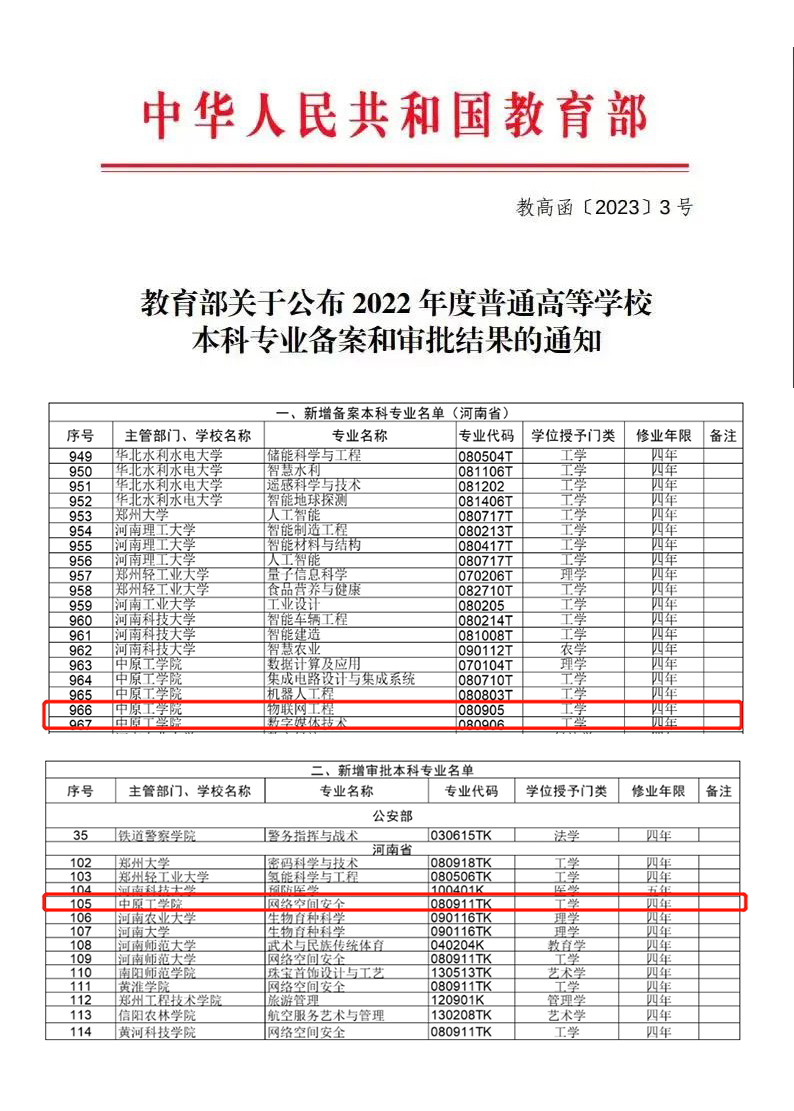 近日,教育部发布《2022年度普通高等公司本科专业备案和审批结果》(教高函〔2023〕3号),公司物联网工程、数字媒体技术、网络空间安全3个新申报专业成功获批。