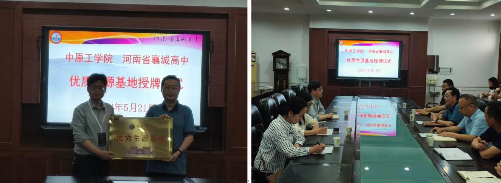 许昌襄城招生组另外走访了市级示范高中——襄城实验高级中学,与襄城实验高中党委书记宋晓鹏、董事长单亚辉、副董事长蒋双晓、程战桥、纪江浩、校纪工委书记何华等校领导和毕业班班主任代表进行座谈交流,就招生政策、生源基地建设、后续合作等进行了深入的沟通与交流和优质生源基地授牌。