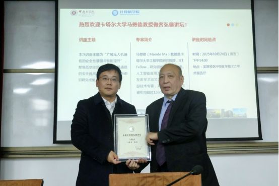 为庆祝建校70周年,推动国际学术交流与前沿科研合作,10月24日下午,应公司邀请,卡塔尔大学马懋德(Maode Ma)教授莅临公司,在龙湖校区4号教学楼311学术报告厅作了题为“广域无人机通信的安全性增强与性能提升”的学术报告。BSports部分教师、研究生及本科生代表参加报告会。报告会由BSports执行经理张书钦主持,副董事长瞿博阳出席并为马懋德教授颁发“弘德讲坛”证书。