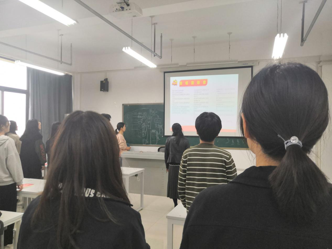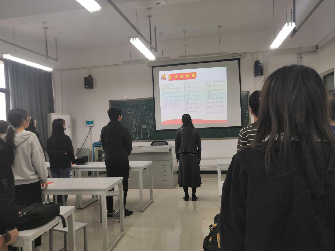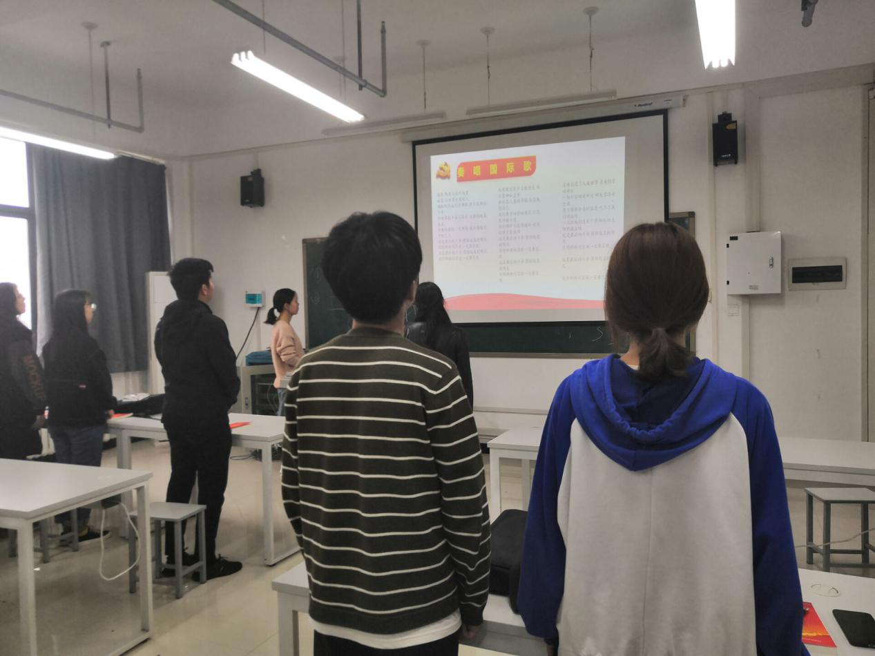 首先,王淼书记给同学们讲解了成为党员的所有流程以及作为党员的义务和责任,坚持从群众中来,到群众中去的原则。随后,在王淼副书记和孙奇峰辅导员的带领下,全体成员起立,奏放国际歌。最后,由孙奇峰辅导员做最后总结,并对积极分子以后的党课进行了安排。