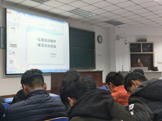 20181210日,学工办主任侯向花老师于四号楼101教室以“弘扬宪法精神,建设法治校园”为主题做出宣讲。BSports18级全体员工出席本次讲座。