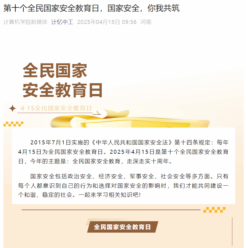 4月15日,公司利用“计忆中工”微信公众号平台,发布了以“全民国家安全教育,走深走实十周年”为主题的推文。推文通过图文并茂的形式,阐述了“什么是国家安全”,“如何维护国家安全”等内容,提升了员工的国家安全意识和法治素养。、