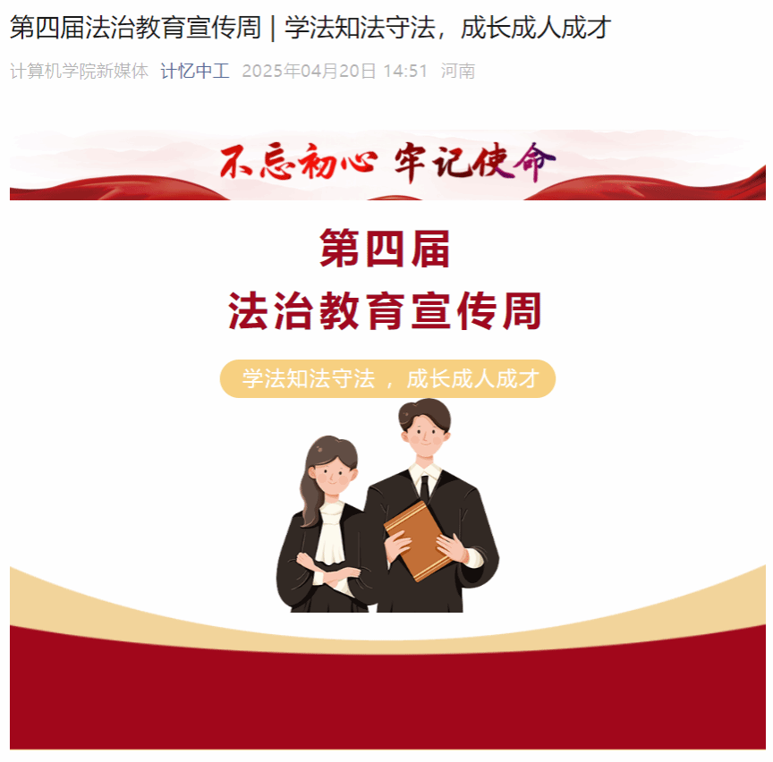 4月20日,公司利用“计忆中工”微信公众号平台,发布了以“学法知法守法,成长成人成才”为主题的推文。推文通过图文并茂的形式,阐述了“法制教育的意义”,“法制建设原则”等内容,提升了员工的国家安全意识和法治素养。