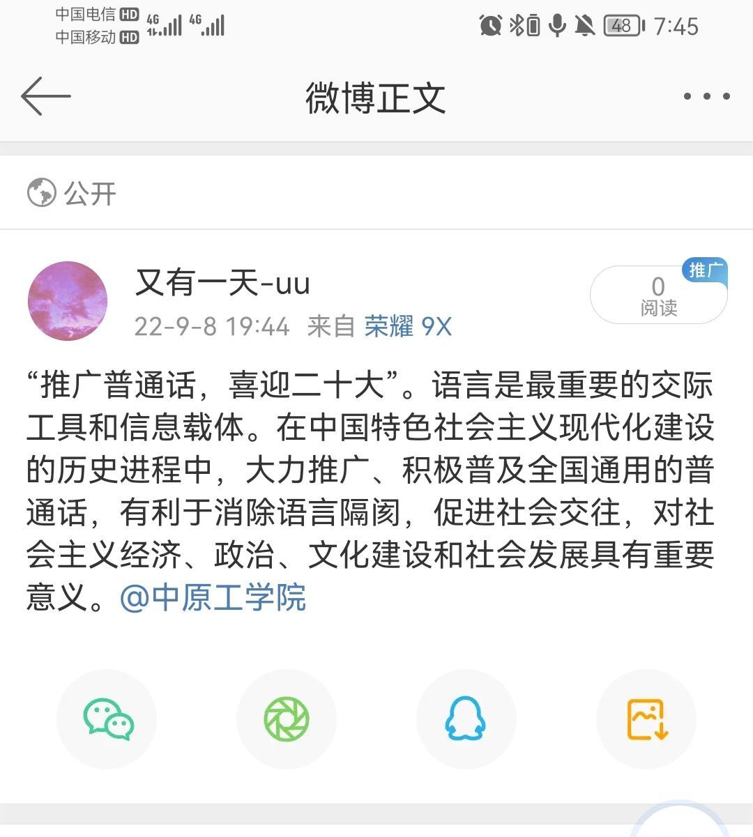 支部党员借助微博,发送“推广普通话,喜迎二十大”宣传语或活动感想,增强了宣传效果。