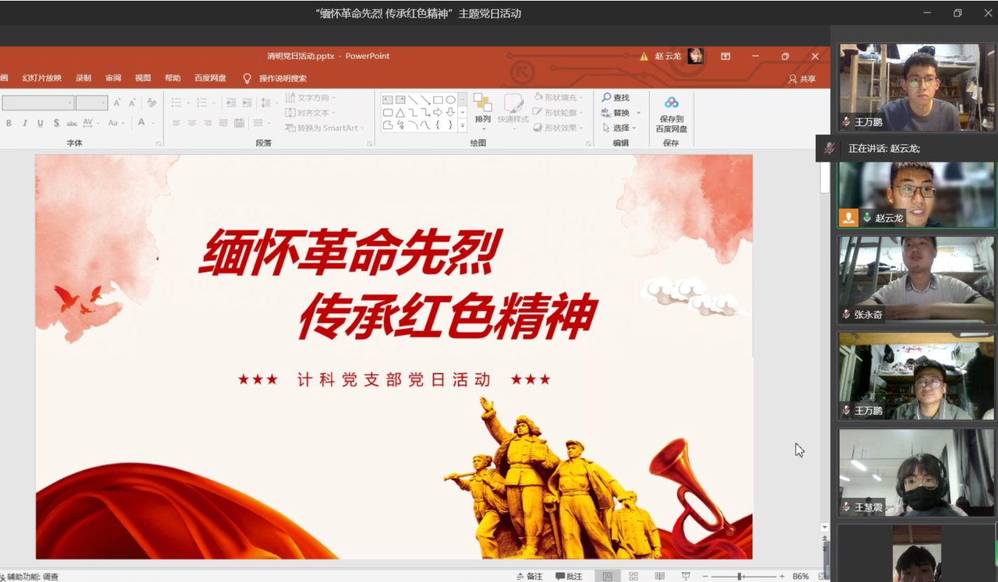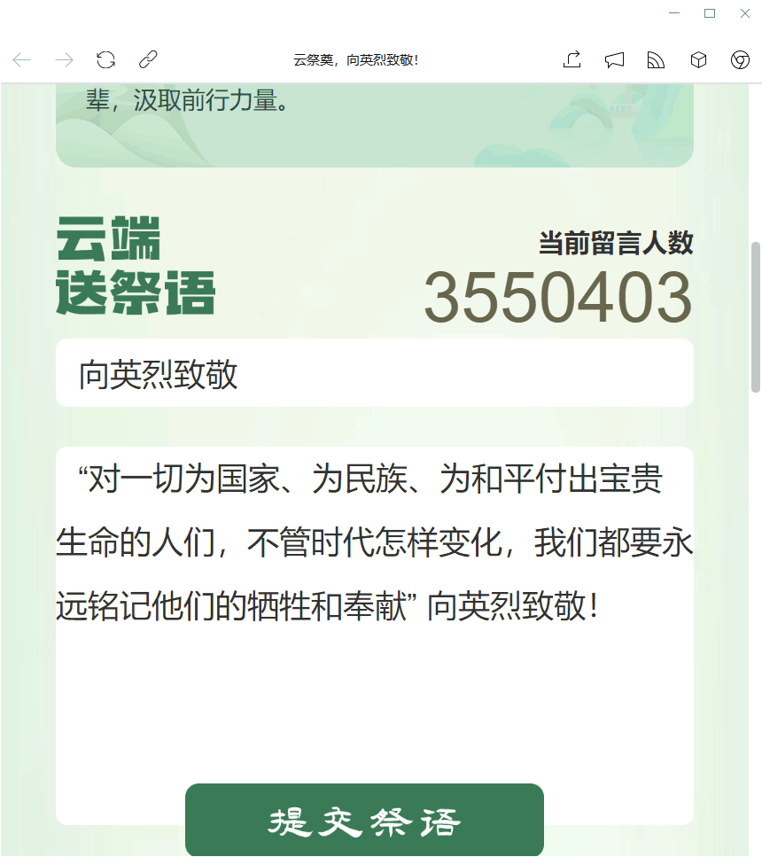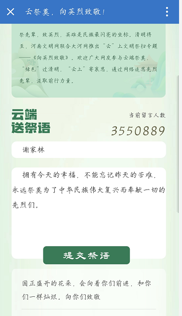 活动内容第三项:网上祭英烈,云端寄哀思。支部党员纷纷在由河南文明网主办的“云祭奠,向英烈致敬!”活动中,向英烈云端送祭语,表达哀思。响应号召,做到了绿色清明,低碳清明,文明清明。