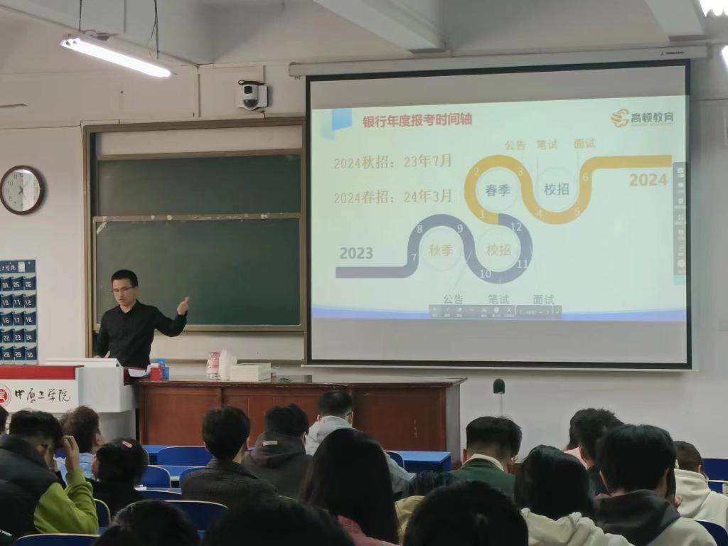宣讲会首先进行了体制内就业机会盘点,介绍了相关考试类型、报名时间、笔试时间、报名渠道以及编制类型。接着进行了更为详细的讲解,首先是公职类就业科普,国考、省考、选调生、事业单位、三支一扶就业形势分析及备考规划;然后是央国企招聘科普,央国企就业形势分析,薪资待遇、报名解析,烟草、电网、三大运营商、三桶油等招聘解读;最后是银行招聘科普,银行就业形式分析、薪水福利、行业形势分析,25考季招聘公告解读及报名条件分析。宣讲上强调同学们要找到自己的职业发展方向,突出自己的专业能力,提升自身竞争力,鼓励同学们找准自我定位,迎难而上。